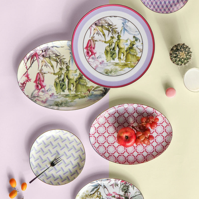 Pastel colors and a refined combination of classic and contemporary decorativemotifs make this collection irresistibly hip and yet timeless. Six different table settings, six different pastel shades, 6 geometries and a variety of subjects which, in a harmonious play of references and assonances, contribute to a unique, cheerful and refined atmosphere.